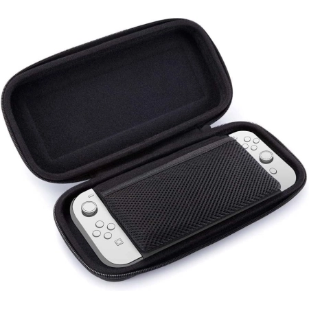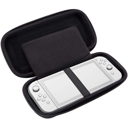 In this hard-shell black carrying case, you can safely and securely transport your favorite Nintendo Switch, Switch Lite or Switch – OLED Model game console, including the attached Joy-Con controllers in the case of the Switch and Switch – OLED Model consoles. A padded divider in the middle of the case ensures that the consoles screen does not suffer any scratches during transport, and in the mesh pocket on the other side you will find enough space for the power adapter and cards with other games. The case also includes a removable mid-base for the Switch Lite.